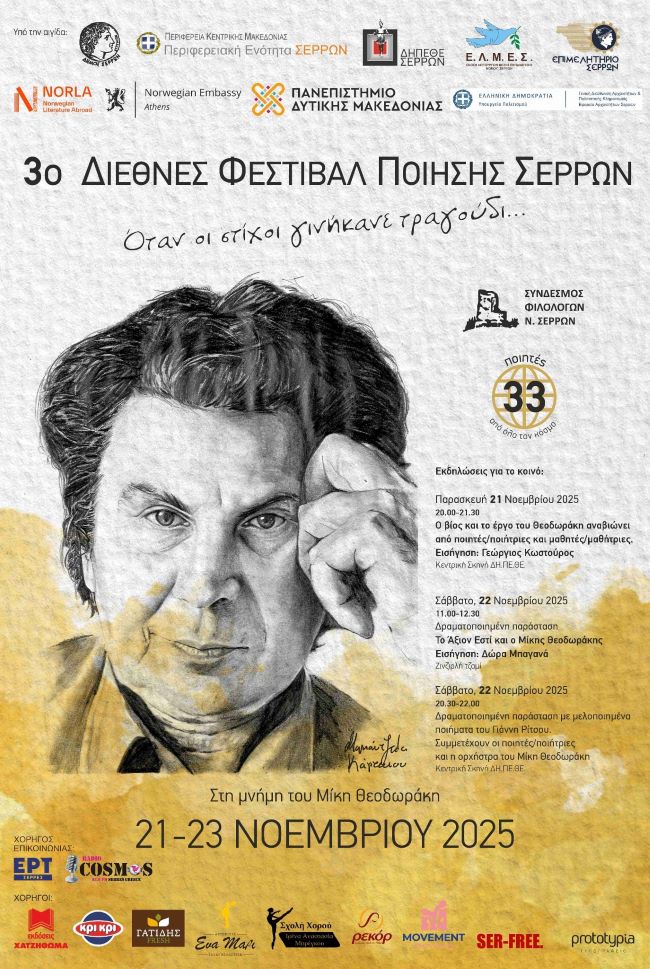 Ο Σύνδεσμος Φιλολόγων Νομού Σερρών πιστός στο ραντεβού του με την ποίηση, διοργανώνει το 3ο Διεθνές Φεστιβάλ Ποίησης Σερρών στις 21-23 Νοεμβρίου. Προσκεκλημένοι 33 ποιητές και ποιήτριες από όλον τον κόσμο. Το Φεστιβάλ είναι αφιερωμένο στη μελοποιημένη ποίηση του Μίκη Θεοδωράκη και έχει τίτλο «Όταν οι στίχοι γινήκανε τραγούδι». Οι εκδηλώσεις που θα λάβουν χώρα και είναι ανοικτές στο κοινό είναι οι εξής: