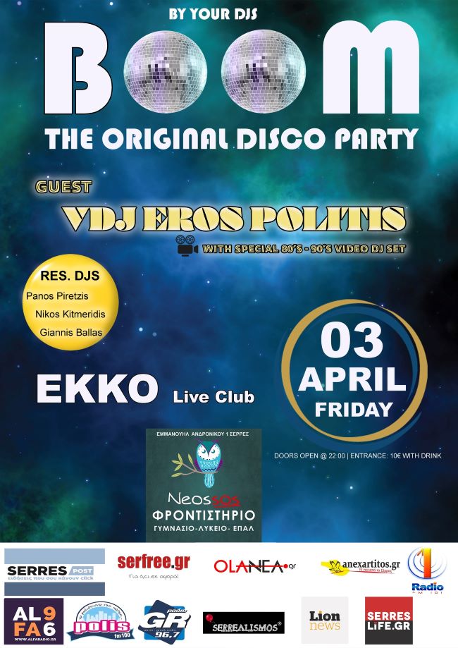 Για πρώτη φορά καλεσμένος στα decks του BOOM o VDJ EROS (from disco Figaro Θεσσαλονίκη, Λατισκοτέκ θεσσαλονίκη, disco La Mamounia Athens, disco Barbarella Athens, Studio 54 Κύπρος),για να μας παρουσιάσει ένα μοναδικό video dj set με όλα τα αγαπημένα video clips,απο τα 80’s & 90’s