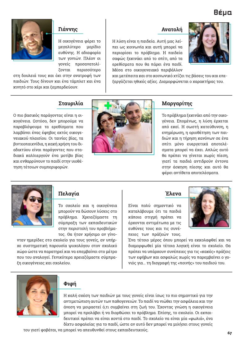 Στο πλαίσιο του αφιερώματος που ετοίμασε το περιοδικό Ser-Free για το θέμα της βίας στις νεαρές ηλικίες και πώς αυτή συνδέεται με τα social media, η συνεργάτιδά μας Μαριάννα Τσιολπίδου ρώτησε τη γνώμη του κόσμου: ποιες πιστεύουν πως είναι οι αιτίες του φαινομένου και ποια θα μπορούσε να είναι η λύση.