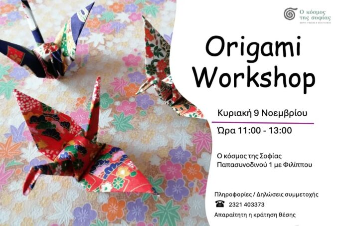 Με αφορμή την παγκόσμια ημέρα origami που είναι στις 11 Νοεμβρίου, σας προσκαλούμε σε ένα δημιουργικό εργαστήρι για μικρούς και μεγάλους.