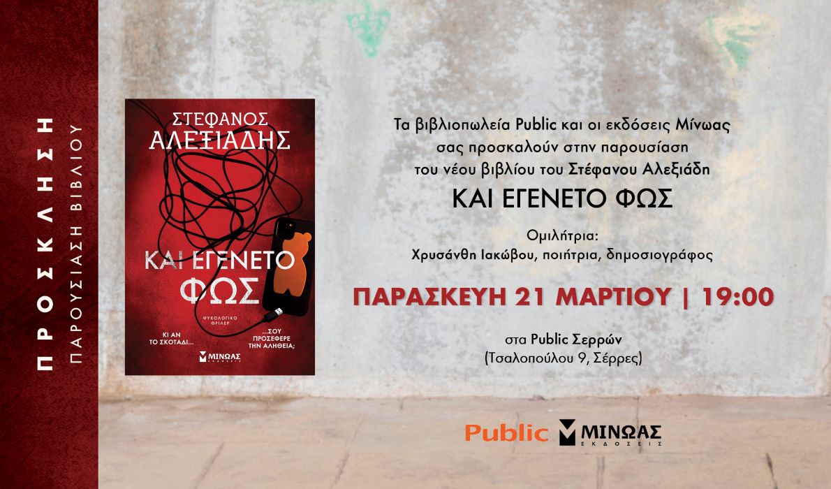 ΑρχικήCity GuideΑτζέντα Παρουσίαση του βιβλίου “Και εγένετο φως” του Στέφανου Αλεξιάδη 17/03/2025 531 FacebookXPinterestWhatsApp Ο συγγραφέας Στέφανος Αλεξιάδης θα βρίσκεται την Παρασκευή 21 Μαρτίου στα Public στις 19:00 για την παρουσίαση του νέου του βιβλίου “Και εγένετο φως” (Εκδόσεις Μίνωας). Για το βιβλίο θα μιλήσει η Χρυσάνθη Ιακώβου, ποιήτρια-δημοσιογράφος. μερίδιο FacebookXPinterestWhatsApp Προηγούμενο άρθροΟι Σερραίοι του Rally AcropolisΕπόμενο άρθροΠαρουσιάστηκε το βιβλίο του Στέφανου Αλεξιάδη “Και εγένετο φως” ΣΕ ΑΥΤΗ ΤΗΝ ΚΑΤΗΓΟΡΙΑ Ατζέντα Θεατρική παράσταση «Χάσαμε τη Θεία Στοπ» του Γιώργου Διαλεγμένου Ατζέντα Θεατρική παράσταση «ΜΗΝ ΚΛΑΙΣ ΡΕ ΓΟΡΓΟΝΑ» του Παναγιώτη Γκούβερη Ατζέντα Θεατρική παράσταση ΟΙΔΙΠΟΥΣ ΤΥΡΑΝΝΟΣ του Σοφοκλή ΤΕΛΕΥΤΑΙΑ ΑΡΘΡΑ Οι Προτάσεις Μας! Φροντιστήριο Νεοσσός: ολιγομελή τμήματα για σωστή δουλειά στην τάξη! Special Events Λογοτεχνικό πρωϊνό με βιβλία της Σωτηρίας Κυρμανίδου Things I Love Things I Love: Κωνσταντίνος Αλέξανδρος Κουκουζέλης Ατζέντα Θεατρική παράσταση «Χάσαμε τη Θεία Στοπ» του Γιώργου Διαλεγμένου Ατζέντα Θεατρική παράσταση «ΜΗΝ ΚΛΑΙΣ ΡΕ ΓΟΡΓΟΝΑ» του Παναγιώτη Γκούβερη