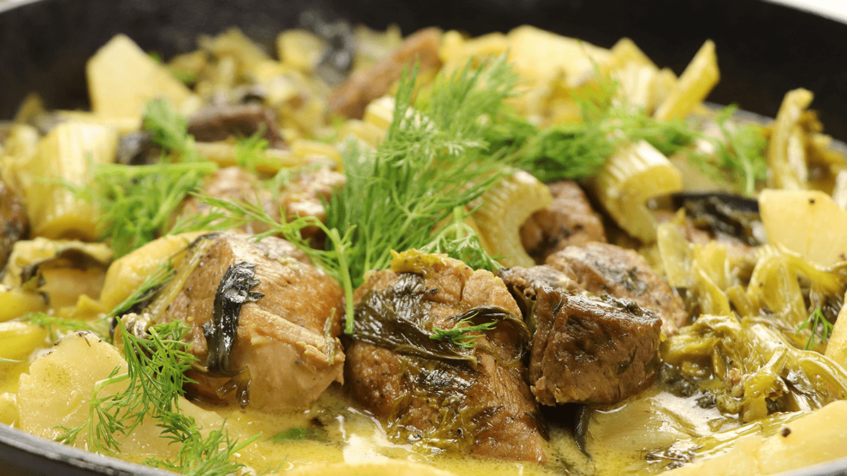 Ένα πιάτο που δεν λείπει από κανένα σερραϊκό σπίτι την περίοδο των γιορτών. Το χοιρινό με πράσο και σέλινο έχει λιπαρότητα και φυτικότητα που συνδυάζονται εκπληκτικά με τη δύναμη ενός βαρελίσιου Ασύρτικου ή την πιο μαλακή, νόστιμη δομή ενός Βιδιανού.